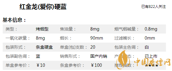 紅金龍(愛你)硬藍煙身長90mm,焦油含量僅為8mg/支,煙支修長雅致、煙氣淡雅醇厚、口感醇和細膩。帶給品吸者新鮮有趣的吸食體驗和適中的滿足感。吸食口感上,和南京炫赫門比較相似,低焦、低危害對身體危害也要低一些。只不過目前部分地區(qū)已經(jīng)買不到該款煙了,消費者要注意甄別真假,以免上當受騙。