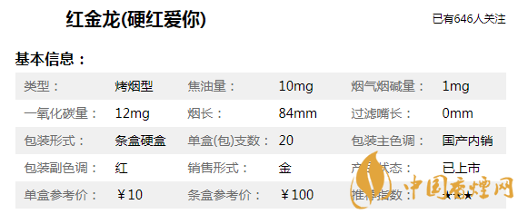 紅金龍(愛你)是武煙旗下重點品牌紅金龍卷煙2014年底新推出的卷煙系列,有紅金龍(硬愛你)、紅金龍(愛你)硬藍幾種規(guī)格。在擠壓式競爭的當下,紅金龍(硬藍愛你)的脫穎而出絕非巧合。它是企業(yè)對品牌發(fā)展用心,對市場競爭走心,對產(chǎn)品創(chuàng)新用心的結(jié)果。紅金龍硬(藍紅)愛你多少錢一條?下面香煙網(wǎng)小編為大家整理介紹。