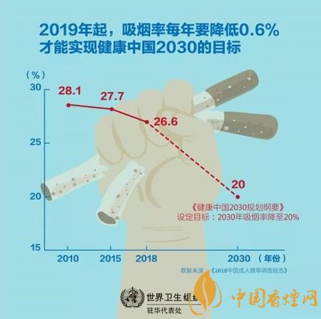 這是中國政府發(fā)布的首個面向人群、以多部門協(xié)作的形式應(yīng)對非傳染性疾病風(fēng)險因素的健康戰(zhàn)略?!督】抵袊袆印反_定了國家將重點關(guān)注的15個專項行動,以提高全民健康水平、推進實現(xiàn)健康中國目標(biāo)。煙草控制是第四個專項行動,用以實現(xiàn)到2030年將成人吸煙率降低到20%的目標(biāo)。這體現(xiàn)了中國對可持續(xù)發(fā)展目標(biāo)和世界衛(wèi)生組織《煙草控制框架公約》的承諾。然而,中國的煙草控制仍然面臨許多挑戰(zhàn)。2018年中國成人煙草調(diào)查顯示,15歲及以上人群的吸煙率仍然很高,達26.6%。