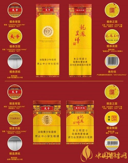 改名為天子(硬珍品龍鳳呈祥)之后,這款香煙的參數(shù)依然為:焦油量:11mg;煙堿量:1.1mg;一氧化碳量:12mg;煙長為84mm。香煙售價為21元/包,批發(fā)價格:180.2元/條。