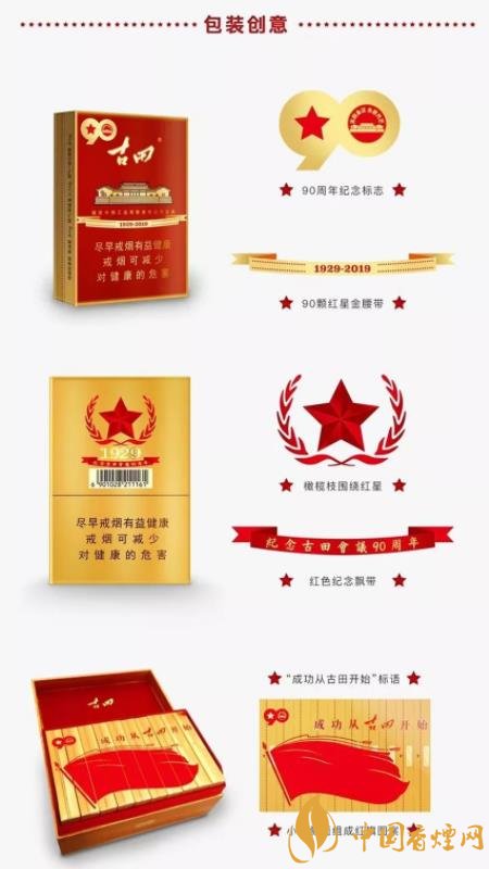 古田金中支90周年紀(jì)念版在包裝正面左上角有90周年紀(jì)念標(biāo)志,在煙包腰部位置有90顆紅星組成的金腰帶;在包裝背面有以橄欖枝圍繞的紅星和紅色紀(jì)念飄帶;打開煙包可以看見清晰的“成功從古田開始”的標(biāo)語和小盒側(cè)面組成的紅旗圖案。種種設(shè)計(jì),巧具匠心,輝映歷史。此時(shí)正值歲末年初元旦之際,古田金中支90周年紀(jì)念版是紅色卷煙中不可多得的禮贈(zèng)、過節(jié)佳選。