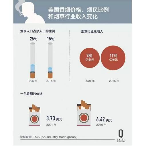 根據(jù)市場調(diào)研公司的報(bào)告,2001 年至 2016 年期間,美國香煙的銷售數(shù)量減少了 37%,與此同時(shí),美國吸煙人口的比例也下降了,但煙草公司的利潤卻上升了。在2016 年,美國煙草行業(yè)的利潤達(dá)到了 184 億美元。(跟我國一比這好像都不算什么了)