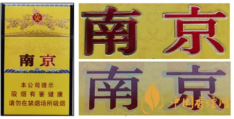 假冒卷煙:該款假冒卷煙南京字體邊緣金色輪廓線和筆畫內(nèi)無小圓點,字體筆畫顏色暗淡,燙金套印有偏差。圖3上真下假