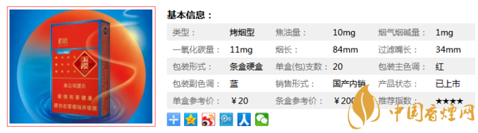 | 類型 :烤煙型 | 焦油量 :10mg | 煙氣煙堿量 :1mg | 一氧化碳量 :11mg |