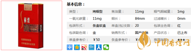 | 類(lèi)型 :烤煙型 | 焦油量 :11mg | 煙氣煙堿量 :1mg | 一氧化碳量 :11mg |
