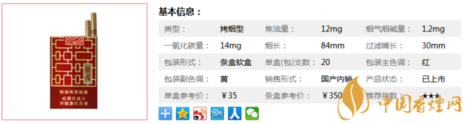 類型 :烤煙型 焦油量 :12mg 煙氣煙堿量 :1.2mg 一氧化碳量 :14mg