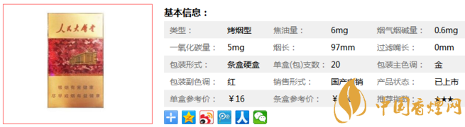 類型 :烤煙型 焦油量 :6mg 煙氣煙堿量 :0.6mg 一氧化碳量 :5mg