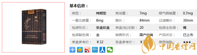 類型 :烤煙型 焦油量 :7mg 煙氣煙堿量 :0.7mg 一氧化碳量 :8mg