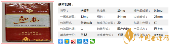 類型 :烤煙型 焦油量 :10mg 煙氣煙堿量 :0.8mg 一氧化碳量 :12mg