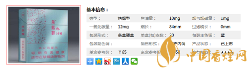 類型 :烤煙型 焦油量 :10mg 煙氣煙堿量 :1mg 一氧化碳量 :12mg