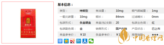 類型 :烤煙型 焦油量 :10mg 煙氣煙堿量 :1mg 一氧化碳量 :10mg