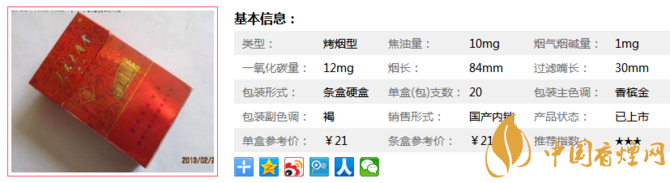 類型 :烤煙型 焦油量 :10mg 煙氣煙堿量 :1mg 一氧化碳量 :12mg