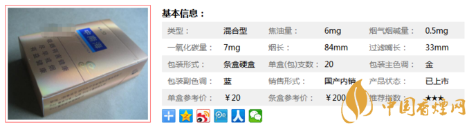 類型 :混合型 焦油量 :6mg 煙氣煙堿量 :0.5mg 一氧化碳量 :7mg