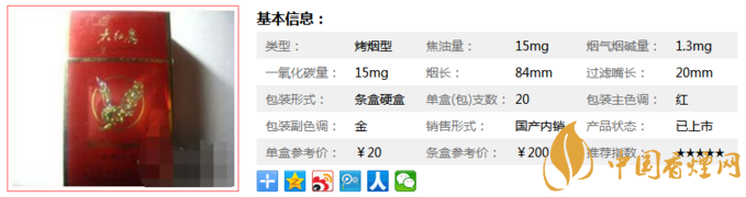 | 類型 :烤煙型 | 焦油量 :13mg | 煙氣煙堿量 :1.2mg | 一氧化碳量 :13mg |