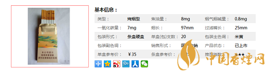 | 類型 :烤煙型 | 焦油量 :8mg | 煙氣煙堿量 :0.8mg | 一氧化碳量 :7mg |