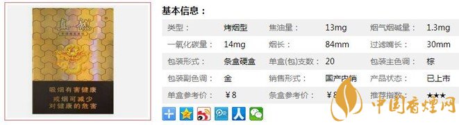 類(lèi)型 :烤煙型 焦油量 :13mg 煙氣煙堿量 :1.3mg 一氧化碳量 :14mg