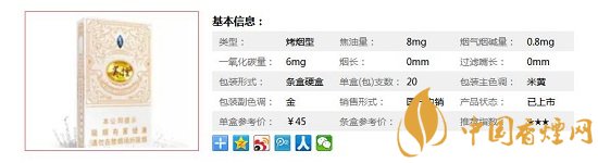 類型 :烤煙型 焦油量 :8mg 煙氣煙堿量 :0.8mg 一氧化碳量 :6mg