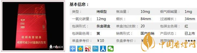 類型 :烤煙型 焦油量 :10mg 煙氣煙堿量 :1mg 一氧化碳量 :12mg