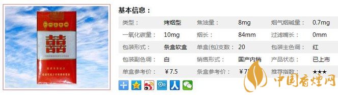 類型 :烤煙型 焦油量 :8mg 煙氣煙堿量 :0.7mg 一氧化碳量 :10mg