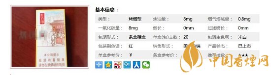 一盒20支,煙長94mm,焦油量8mg,煙堿量0.8mg,一氧化碳量8mg
