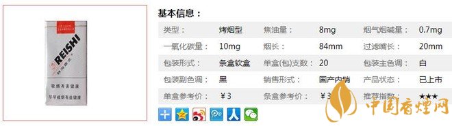 | 類型 :烤煙型 | 焦油量 :8mg | 煙氣煙堿量 :0.7mg | 一氧化碳量 :10mg |