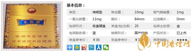 | 類型 :烤煙型 | 焦油量 :10mg | 煙氣煙堿量 :1mg | 一氧化碳量 :11mg |