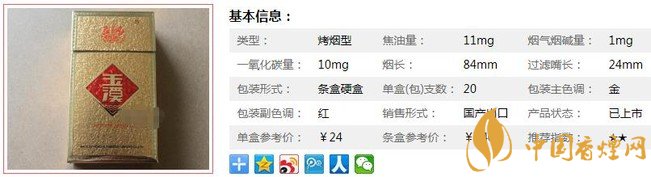 類型 :烤煙型 焦油量 :11mg 煙氣煙堿量 :1mg 一氧化碳量 :10mg