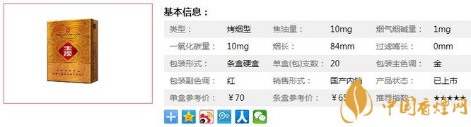 類型 :烤煙型 焦油量 :10mg 煙氣煙堿量 :1mg 一氧化碳量 :10mg