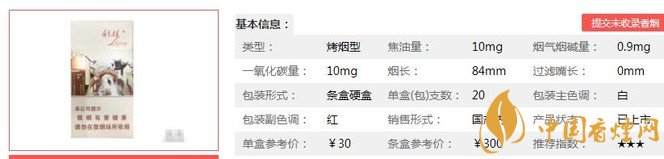 類型 :烤煙型 焦油量 :10mg 煙氣煙堿量 :0.9mg 一氧化碳量 :10mg