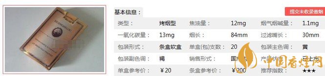 類型 :烤煙型 焦油量 :12mg 煙氣煙堿量 :1.1mg 一氧化碳量 :13mg