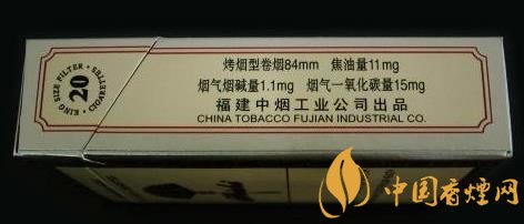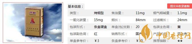 類型 :烤煙型 焦油量 :11mg 煙氣煙堿量 :1.1mg 一氧化碳量 :15mg