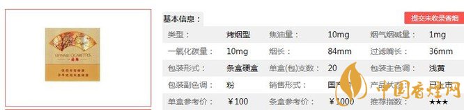 | 類型 :烤煙型 | 焦油量 :10mg | 煙氣煙堿量 :1mg | 一氧化碳量 :10mg |