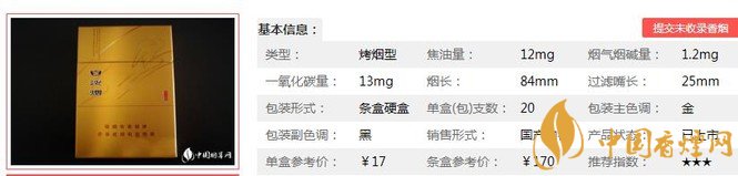 類型 :烤煙型 焦油量 :8mg 煙氣煙堿量 :0.9mg 一氧化碳量 :10mg