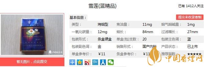 雪蓮藍(lán)精品煙支長84mm,過濾嘴長27mm,優(yōu)選國內(nèi)優(yōu)質(zhì)煙葉,應(yīng)用高分子合成技術(shù)等多項(xiàng)現(xiàn)代工藝技術(shù)精制而成;香氣自然、高雅,余味醇厚、干凈舒適。下面我們一起來看雪蓮藍(lán)精品的參數(shù)信息:焦油量:11mg 煙堿量:1.0mg 一氧化碳量:12mg
