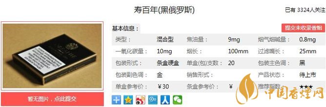 壽百年黑俄羅斯煙支長100mm,過濾嘴長25mm,華麗的金色煙嘴加上神秘的黑色煙身,絕對(duì)的高貴。下面我們一起來看壽百年黑俄羅斯的參數(shù)信息:焦油量:9mg 煙堿量:0.8mg 一氧化碳量:10m