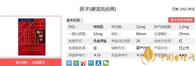 以上便是由香煙網(wǎng)小編為大家介紹的關(guān)于嬌子硬龍鳳經(jīng)典價格及參數(shù) 嬌子硬龍鳳經(jīng)典獨(dú)家口感分析的相關(guān)信息,想要了解更多有關(guān)內(nèi)容請點(diǎn)擊:嬌子軟龍鳳呈祥售價10元一包 煙氣細(xì)膩口感舒適