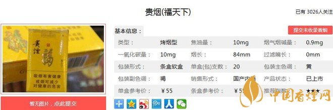 貴煙福天下在追求香氣細膩柔和基礎上,保證一定的口腔充盈性和濃度,表現(xiàn)出煙草本香明顯并透發(fā)出特色果香香氣。刺激性較低,協(xié)調(diào),整只煙透發(fā)出果香、辛香、奶香、烤香、蜜甜香的香氣特征,使產(chǎn)品在抽吸時令人感受到愉悅舒適的享受。經(jīng)香煙網(wǎng)小編市場調(diào)查貴煙福天下售價為55元/包。