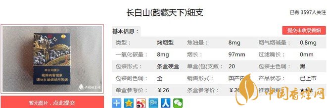 長(zhǎng)白山韻藏天下細(xì)支煙支長(zhǎng)97mm,專有的沉香活性成分制備技術(shù)及沉香載體柔性加工技術(shù),保障了香氣釋放量的均勻一致,吸煙過(guò)程更輕松。下面我們一起來(lái)看長(zhǎng)白山韻藏天下細(xì)支的參數(shù)信息:焦油量:8mg 煙堿量:0.8mg 一氧化碳量:8mg