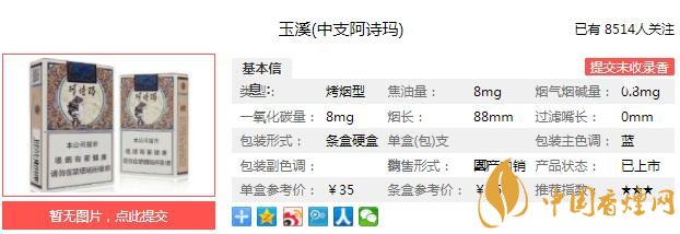 玉溪中支阿詩瑪煙支長88mm,濾嘴的中部是阿詩瑪標志性的側影頭像。濾嘴下部是上下兩個圓環(huán),中間正反印制著阿詩瑪和Ashima標識。下面我們一起來看玉溪中支阿詩瑪?shù)膮?shù)信息:焦油量:8mg 煙堿量:0.8mg 一氧化碳量:8mg