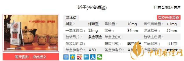 嬌子寬窄逍遙煙支長(zhǎng)84mm,過濾嘴長(zhǎng)25mm,煙支上只有寬窄字樣,兩顆爆珠的位置清晰可見,上香下甜。煙絲填充飽滿,彈性很好。下面我們一起來看嬌子寬窄逍遙的參數(shù)信息:焦油量:10mg 煙堿量:1.1mg 一氧化碳量:12mg