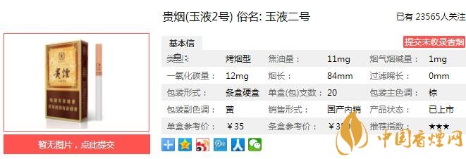 貴煙(玉液2號(hào))科學(xué)運(yùn)用酒中豐富自然香氣成分,通過與天然、原生態(tài)的煙草本香互相配伍,形成豐富、多層次的復(fù)合香韻,實(shí)現(xiàn)煙香與酒味的共同融合,成卷煙產(chǎn)品保潤增香、口感獨(dú)特、回味舒適的特點(diǎn)。經(jīng)香煙網(wǎng)小編市場(chǎng)調(diào)查貴煙(玉液2號(hào))售價(jià)為35元/包。