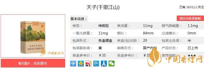 天子(千里江山)以重慶武陵生態(tài)地區(qū)優(yōu)質(zhì)煙葉為原料,匯聚綜合降焦與減害技術(shù)等集成應(yīng)用,在降低有害氣體同時(shí)使煙氣更加清香雅致。下面便是天子(千里江山)的基本參數(shù):焦油量:11mg 煙堿量:1.1mg 一氧化碳量:11mg.