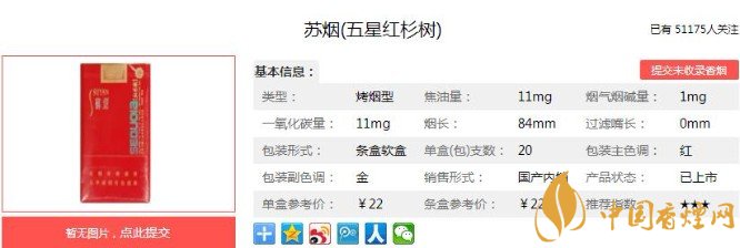 五星紅杉樹(shù)降焦線明顯,煙絲濕度較為合適,填充也飽滿,嗅聞煙支有淡淡的蘇系調(diào)香,貌似莫名的果香透著一絲酒香。煙絲緊實(shí),不會(huì)出現(xiàn)掉渣的情況,總體不錯(cuò)。下面便是蘇煙(五星紅杉樹(shù))的基本參數(shù):焦油量:11mg 煙堿量:1.0mg 一氧化碳量:11mg.