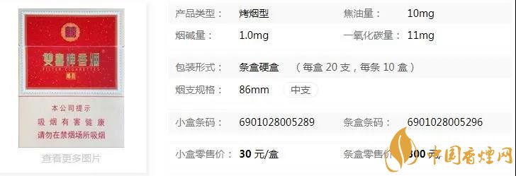 類型 :烤煙型 焦油量 :10mg 煙氣煙堿量 :1mg 一氧化碳量 :11mg
