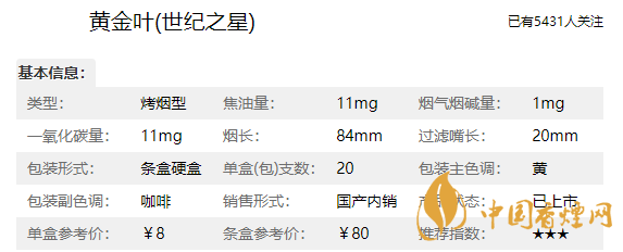 黃金葉香煙品牌定位為中式經(jīng)典醇香型烤煙,一烤透本香、二烤出凈香、三烤成醇香是它的工藝,這款世紀(jì)之星也是完美的繼承了品牌的意志,這款香煙品質(zhì)方面非常的好,那么我們?cè)诮榻B這款黃金葉香煙價(jià)格表和圖片之前,先來(lái)了解一下黃金葉世紀(jì)之星多少錢(qián)一盒,它的零售參考價(jià)為8元/包。