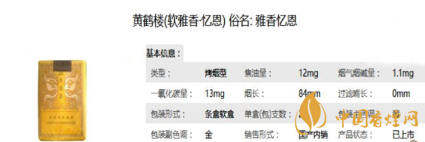 黃鶴樓雅香憶恩煙支長84mm,過濾嘴長25mm。黃色過濾嘴,煙支樣式簡單,印著雅香憶恩幾個字。焦油量:12mg煙堿量:1.1mg一氧化碳量:13mg。