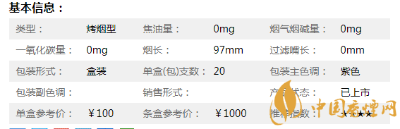 | 煙長:97mm | 過濾嘴長:25mm | 包裝形式:條盒硬盒細支 | 單盒(包)支數(shù):20 |