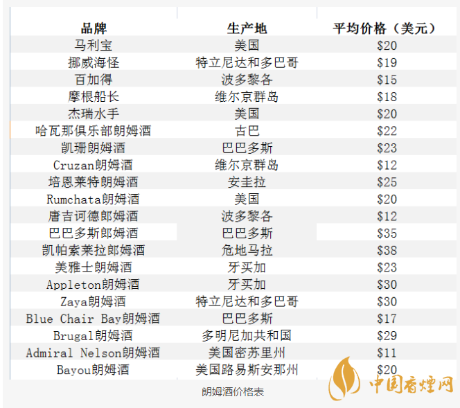 由于朗姆酒種類和品牌繁多,以下列出了20個朗姆酒品牌的平均價格: