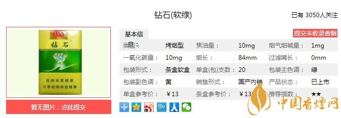 一、鉆石軟綠香煙價格