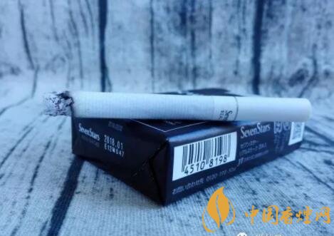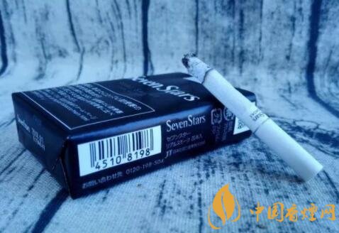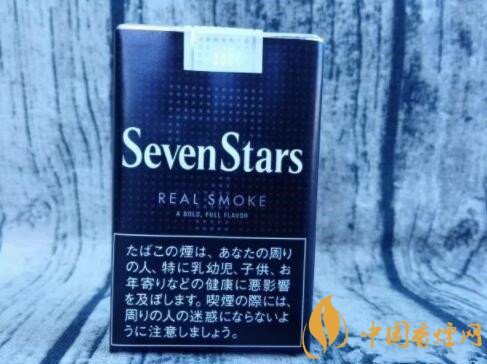 煙盒的正反及左右兩側均以白色的小五角星為圖案,橫平豎直地排列開來。與其它Seven Stars版本一樣,位于煙盒正反兩面中間都有阿拉伯數(shù)字“7”的標識。REAL SMOKE,直譯成中文是“真煙,真正的香煙”之意。A BOLD FULL FLAVOR,中文意思是“煙味十足”。綜合意思,是說此款日稅黑七星的品質之高。